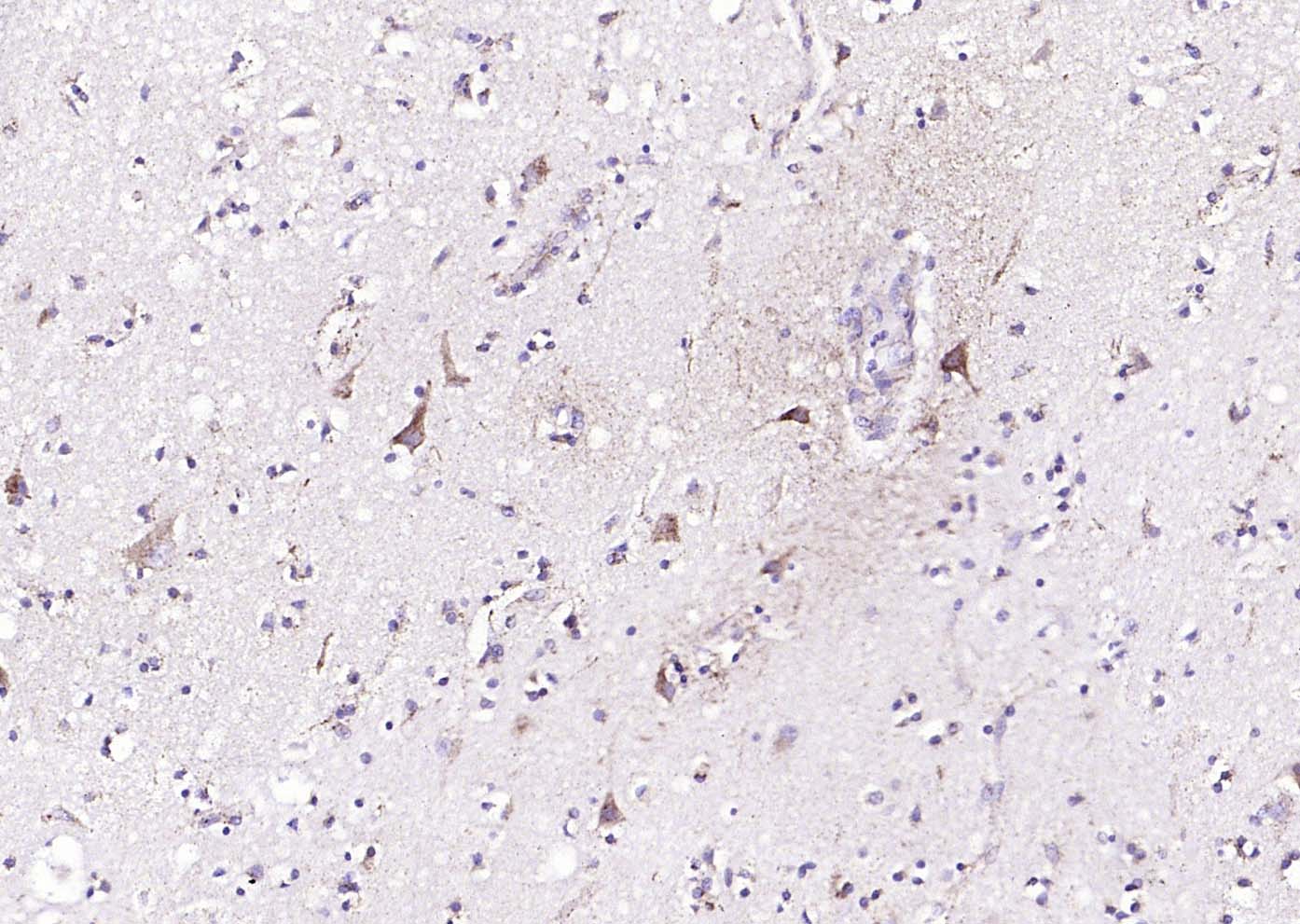 Paraformaldehyde-fixed, paraffin embedded (human brain); Antigen retrieval by boiling in sodium citrate buffer (pH6.0) for 15min; Block endogenous peroxidase by 3% hydrogen peroxide for 20 minutes; Blocking buffer (normal goat serum) at 37°C for 30min; Incubation with (Cyclin G2) Polyclonal Antibody, Unconjugated (bs-25632R) at 1:200 overnight at 4°C, followed by operating according to SP Kit(Rabbit) (sp-0023) instructionsand DAB staining.