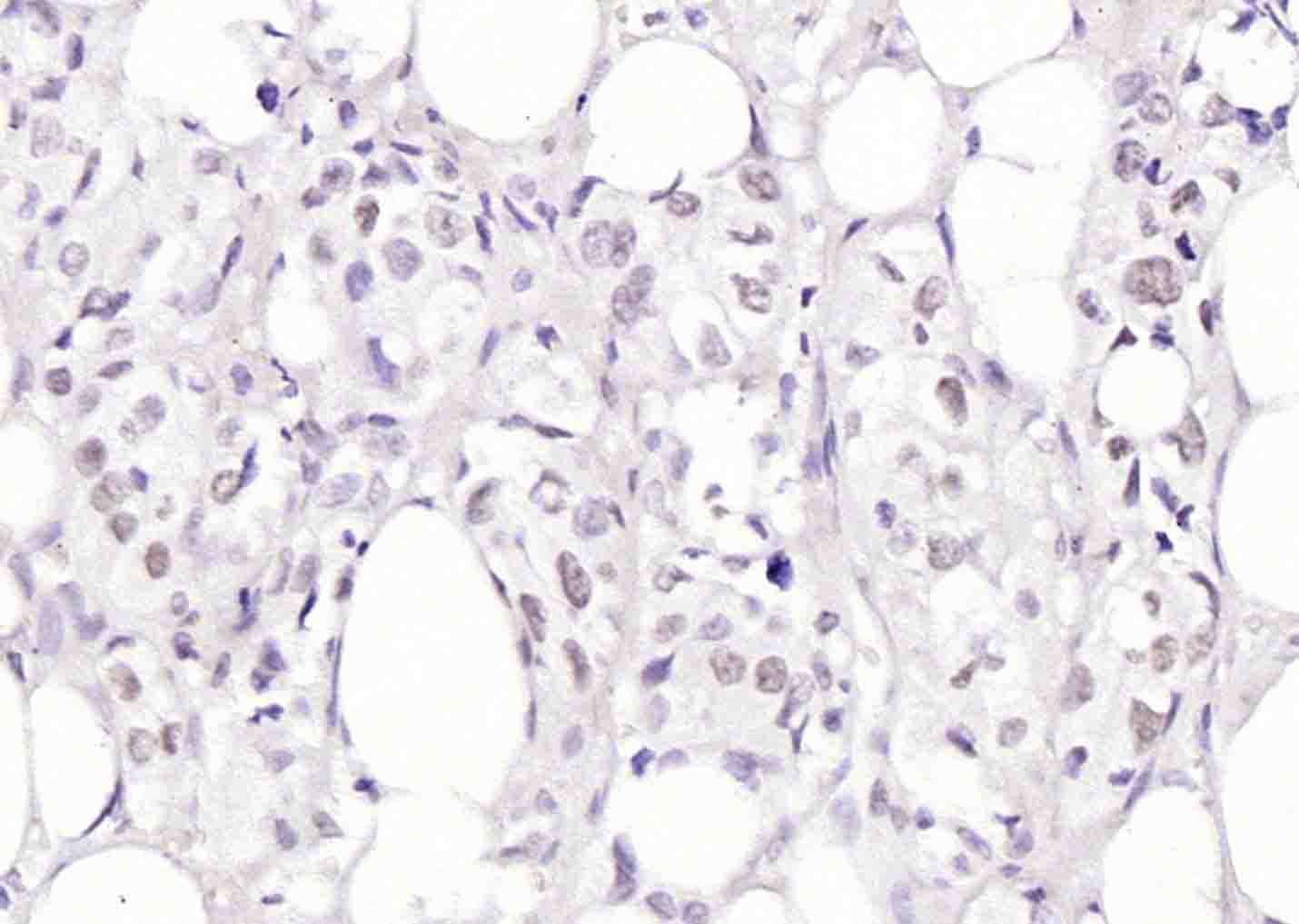 Paraformaldehyde-fixed, paraffin embedded (human breast carcinoma); Antigen retrieval by boiling in sodium citrate buffer (pH6.0) for 15min; Block endogenous peroxidase by 3% hydrogen peroxide for 20 minutes; Blocking buffer (normal goat serum) at 37°C for 30min; Incubation with (Cyclin G) Polyclonal Antibody, Unconjugated (bs-25631R) at 1:200 overnight at 4°C, followed by operating according to SP Kit(Rabbit) (sp-0023) instructionsand DAB staining.
