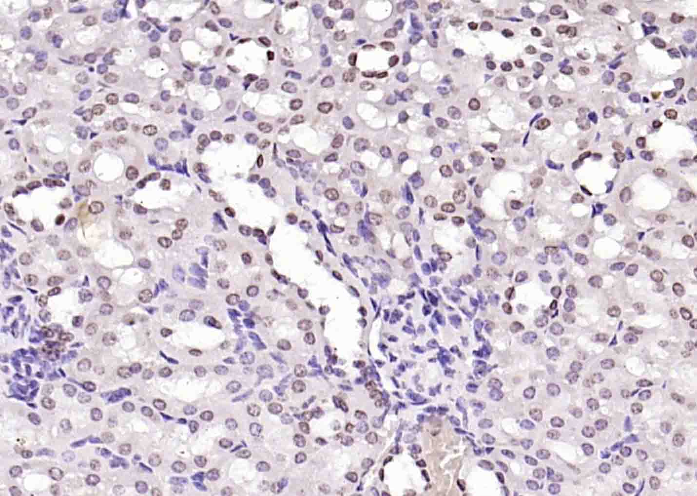 Paraformaldehyde-fixed, paraffin embedded (mouse kidney); Antigen retrieval by boiling in sodium citrate buffer (pH6.0) for 15min; Block endogenous peroxidase by 3% hydrogen peroxide for 20 minutes; Blocking buffer (normal goat serum) at 37°C for 30min; Incubation with (Cyclin G) Polyclonal Antibody, Unconjugated (bs-25631R) at 1:200 overnight at 4°C, followed by operating according to SP Kit(Rabbit) (sp-0023) instructionsand DAB staining.