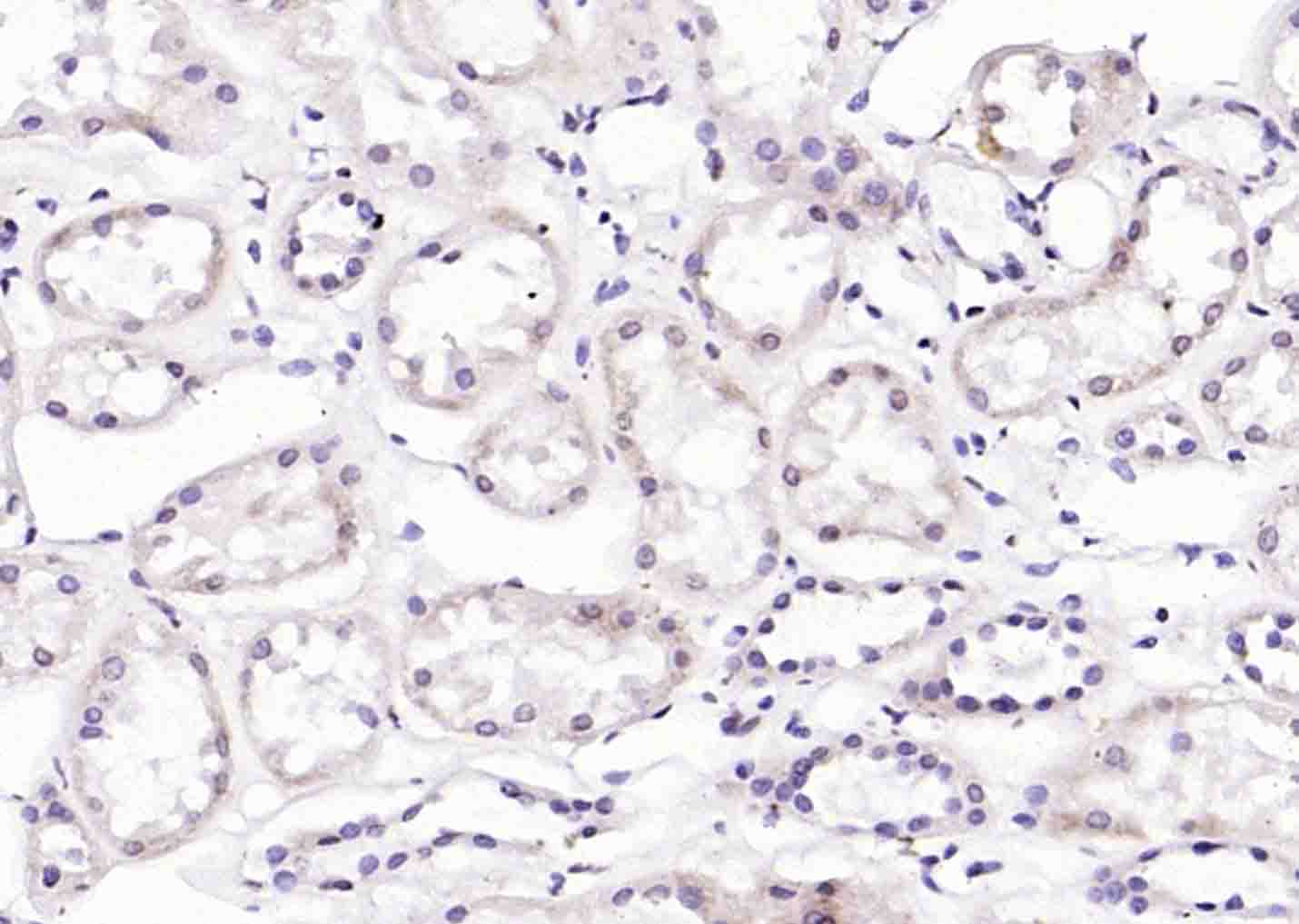 Paraformaldehyde-fixed, paraffin embedded (human kidney); Antigen retrieval by boiling in sodium citrate buffer (pH6.0) for 15min; Block endogenous peroxidase by 3% hydrogen peroxide for 20 minutes; Blocking buffer (normal goat serum) at 37°C for 30min; Incubation with (Cyclin G) Polyclonal Antibody, Unconjugated (bs-25631R) at 1:200 overnight at 4°C, followed by operating according to SP Kit(Rabbit) (sp-0023) instructionsand DAB staining.