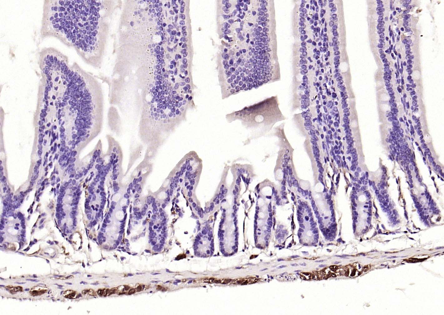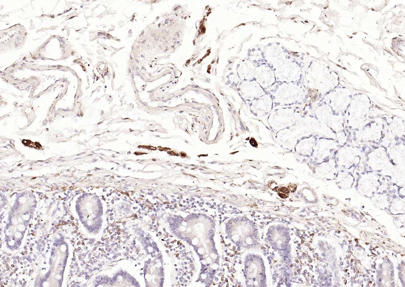 Paraformaldehyde-fixed, paraffin embedded (Human duodenum); Antigen retrieval by boiling in sodium citrate buffer (pH6.0) for 15min; Block endogenous peroxidase by 3% hydrogen peroxide for 20 minutes; Blocking buffer (normal goat serum) at 37°C for 30min; Incubation with (PGP9.5) Monoclonal Antibody, Unconjugated (bsm-41257M) at 1:200 overnight at 4°C, followed by operating according to SP Kit(Mouse)(sp-0024) instructionsand DAB staining.