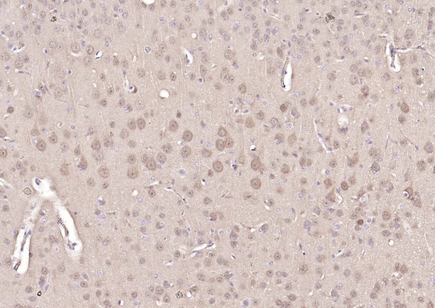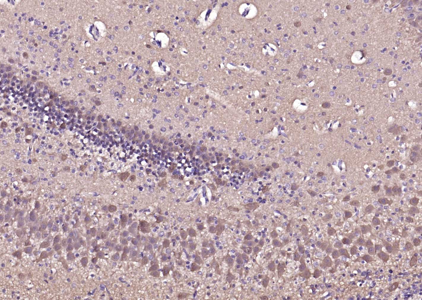 Paraformaldehyde-fixed, paraffin embedded (rat brain); Antigen retrieval by boiling in sodium citrate buffer (pH6.0) for 15min; Block endogenous peroxidase by 3% hydrogen peroxide for 20 minutes; Blocking buffer (normal goat serum) at 37°C for 30min; Incubation with (PGP9.5) Monoclonal Antibody, Unconjugated (bsm-41257M) at 1:200 overnight at 4°C, followed by operating according to SP Kit(Mouse)(sp-0024) instructionsand DAB staining.