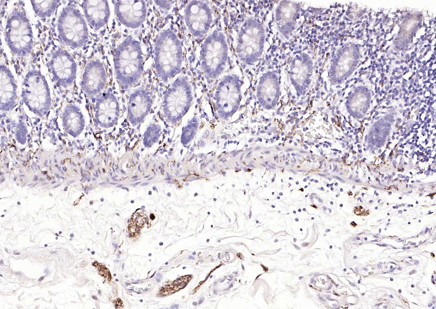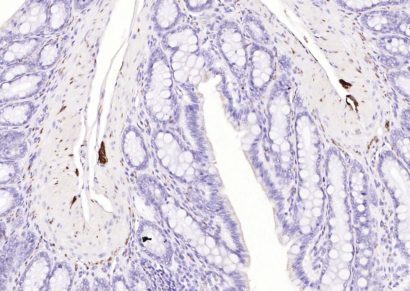 Paraformaldehyde-fixed, paraffin embedded (rat colon); Antigen retrieval by boiling in sodium citrate buffer (pH6.0) for 15min; Block endogenous peroxidase by 3% hydrogen peroxide for 20 minutes; Blocking buffer (normal goat serum) at 37°C for 30min; Incubation with (PGP9.5) Monoclonal Antibody, Unconjugated (bsm-41257M) at 1:200 overnight at 4°C, followed by operating according to SP Kit(Mouse)(sp-0024) instructionsand DAB staining.
