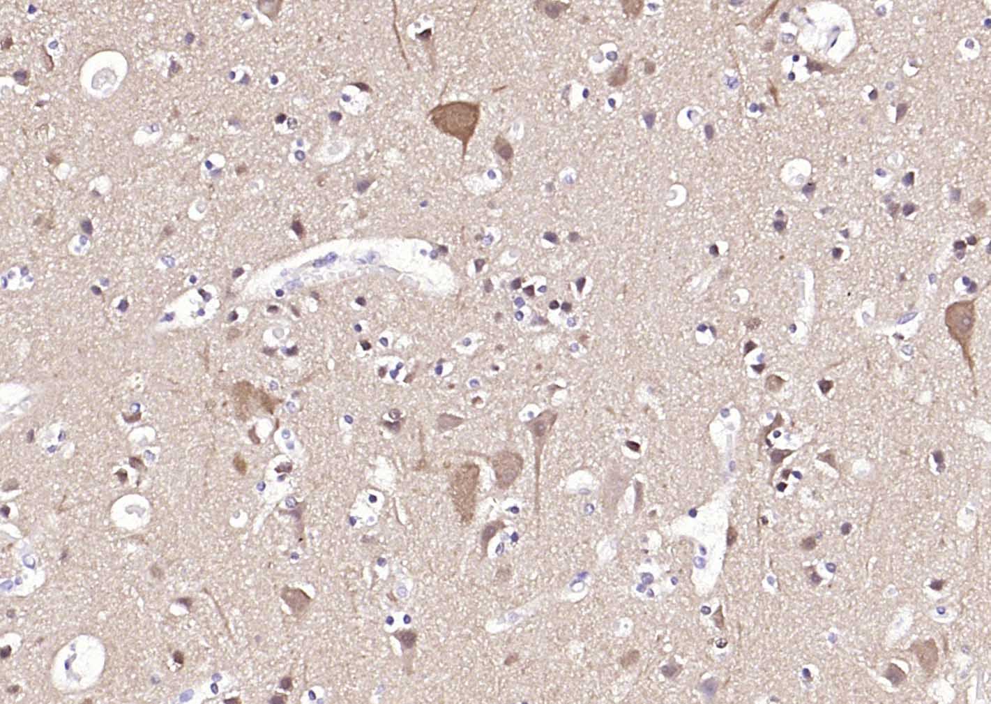 Paraformaldehyde-fixed, paraffin embedded (human brain); Antigen retrieval by boiling in sodium citrate buffer (pH6.0) for 15min; Block endogenous peroxidase by 3% hydrogen peroxide for 20 minutes; Blocking buffer (normal goat serum) at 37°C for 30min; Incubation with (PGP9.5) Monoclonal Antibody, Unconjugated (bsm-41257M) at 1:200 overnight at 4°C, followed by operating according to SP Kit(Mouse)(sp-0024) instructionsand DAB staining.