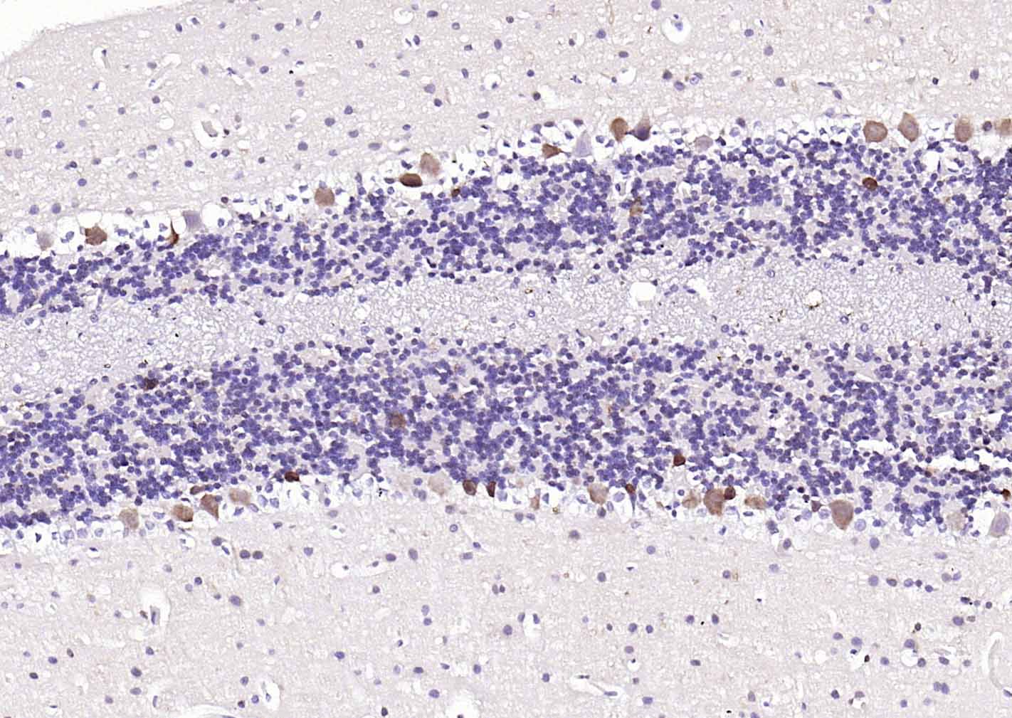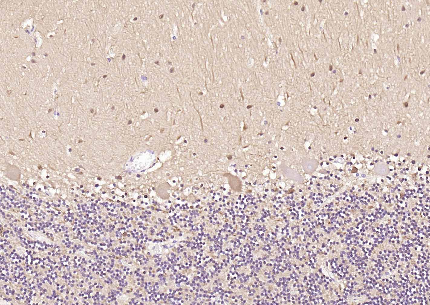 Paraformaldehyde-fixed, paraffin embedded (human cerebellum); Antigen retrieval by boiling in sodium citrate buffer (pH6.0) for 15min; Block endogenous peroxidase by 3% hydrogen peroxide for 20 minutes; Blocking buffer (normal goat serum) at 37°C for 30min; Incubation with (PGP9.5) Monoclonal Antibody, Unconjugated (bsm-41257M) at 1:200 overnight at 4°C, followed by operating according to SP Kit(Mouse)(sp-0024) instructionsand DAB staining.