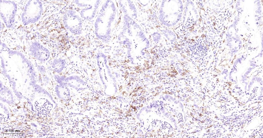 Paraformaldehyde-fixed, paraffin embedded Human Colon Cancer; Antigen retrieval by boiling in sodium citrate buffer (pH6.0) for 15 min; Antibody incubation with CD16a Monoclonal Antibody, Unconjugated(bsm-60782R) at 1:200 overnight at 4°C, followed by conjugation to the bs-0295G-HRP and DAB (C-0010) staining.
