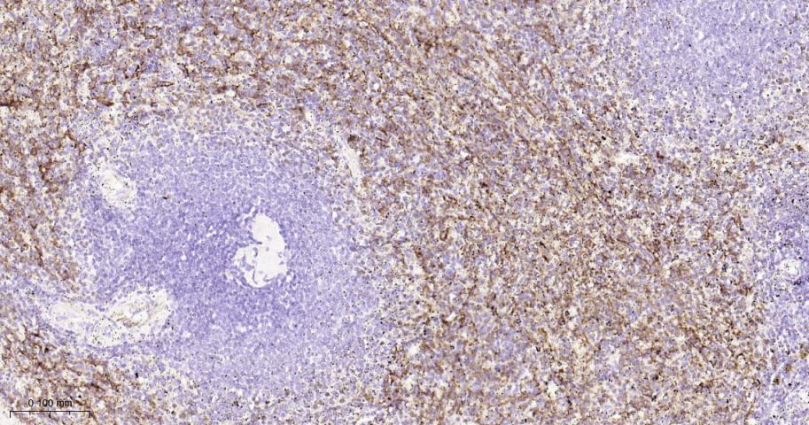 Paraformaldehyde-fixed, paraffin embedded Human Spleen; Antigen retrieval by boiling in sodium citrate buffer (pH6.0) for 15 min; Antibody incubation with CD16a Monoclonal Antibody, Unconjugated(bsm-60782R) at 1:200 overnight at 4°C, followed by conjugation to the bs-0295G-HRP and DAB (C-0010) staining.