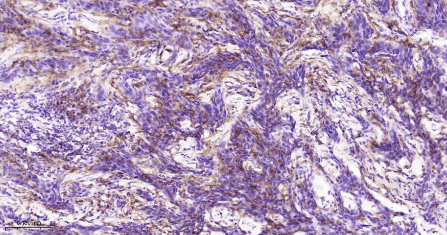 Paraformaldehyde-fixed, paraffin embedded Human Cervical Cancer; Antigen retrieval by boiling in sodium citrate buffer (pH6.0) for 15 min; Antibody incubation with CD16a Monoclonal Antibody, Unconjugated(bsm-60782R) at 1:200 overnight at 4°C, followed by conjugation to the bs-0295G-HRP and DAB (C-0010) staining.