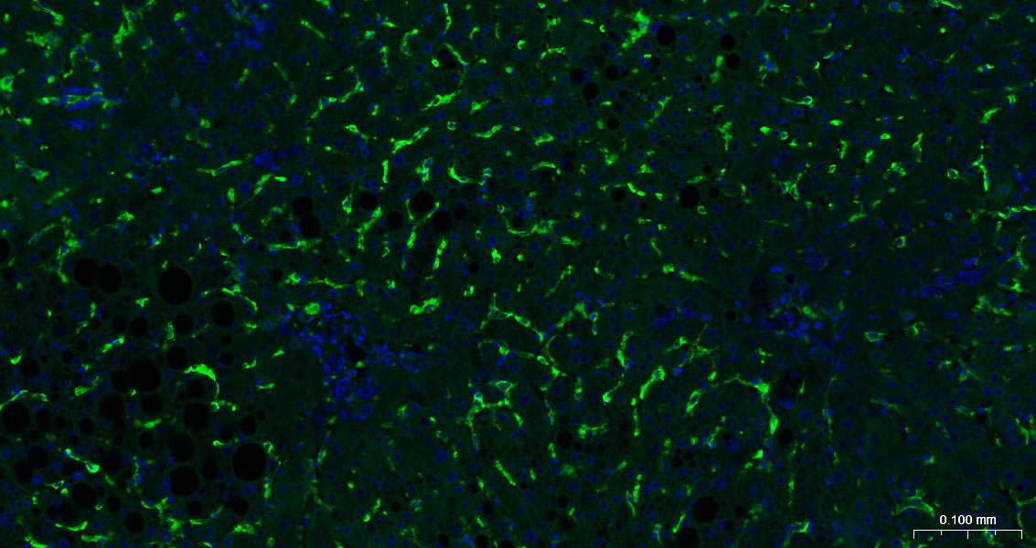 Paraformaldehyde-fixed, paraffin embedded Human Liver; Antigen retrieval by boiling in sodium citrate buffer (pH6.0) for 15 min; The section was incubated with CD16a Monoclonal Antibody, Unconjugated (bsm-60782R) at 1:200 overnight at 4°C. Followed by conjugated Goat Anti-Rabbit IgG antibody (green, bs-0295G-BF488), DAPI (blue, C02-04002) was used to stain the cell nuclei.