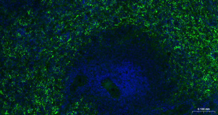 Paraformaldehyde-fixed, paraffin embedded Human Spleen; Antigen retrieval by boiling in sodium citrate buffer (pH6.0) for 15 min; The section was incubated with CD16a Monoclonal Antibody, Unconjugated (bsm-60782R) at 1:200 overnight at 4°C. Followed by conjugated Goat Anti-Rabbit IgG antibody (green, bs-0295G-BF488), DAPI (blue, C02-04002) was used to stain the cell nuclei.