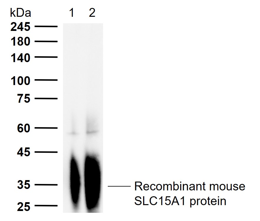 Lane 2: Recombinant mouse SLC15A1 protein, C-His(bs-43598P-200ng)