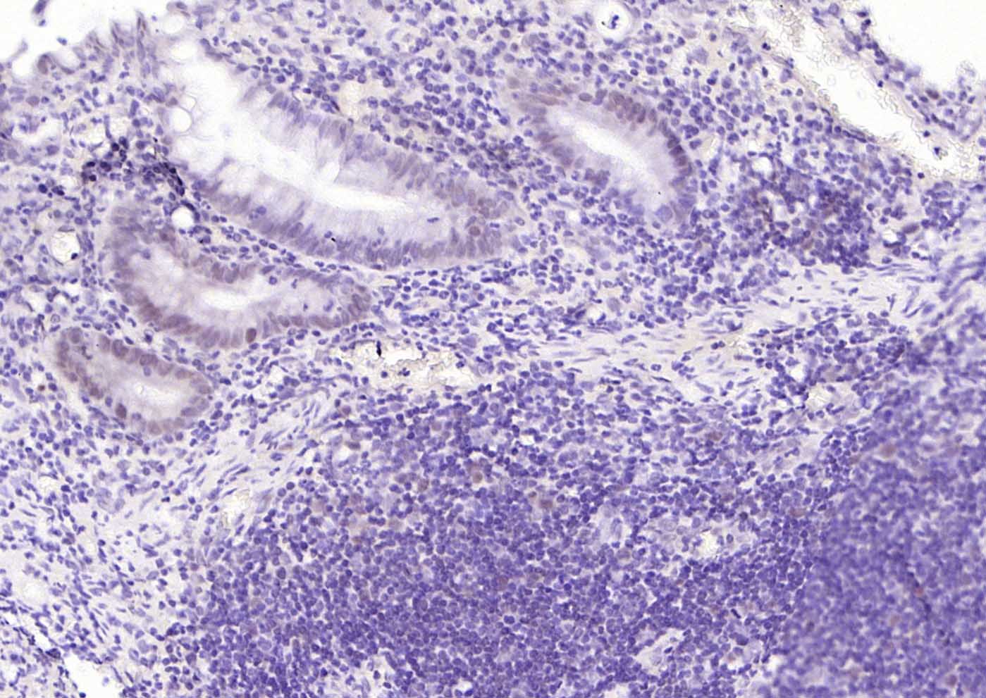 Paraformaldehyde-fixed, paraffin embedded (Human appendix); Antigen retrieval by boiling in sodium citrate buffer (pH6.0) for 15min; Block endogenous peroxidase by 3% hydrogen peroxide for 20 minutes; Blocking buffer (normal goat serum) at 37°C for 30min; Incubation with (MLH1 ) Monoclonal Antibody, Unconjugated (bsm-34145M) at 1:200 overnight at 4°C, followed by operating according to SP Kit(Mouse)(sp-0024) instructionsand DAB staining.