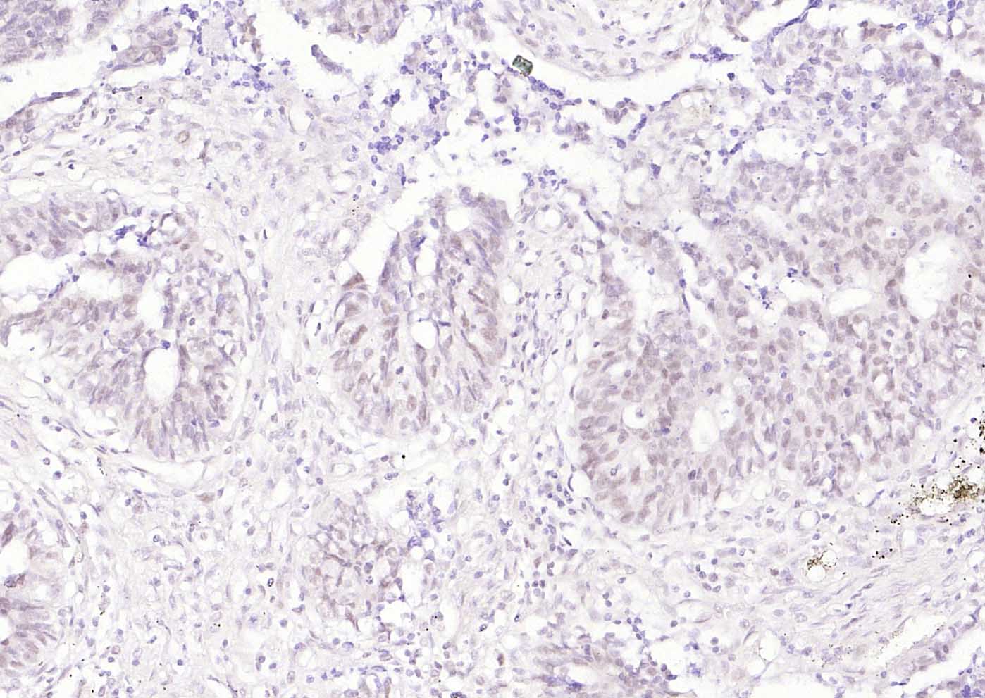 Paraformaldehyde-fixed, paraffin embedded (human colon carcinoma); Antigen retrieval by boiling in sodium citrate buffer (pH6.0) for 15min; Block endogenous peroxidase by 3% hydrogen peroxide for 20 minutes; Blocking buffer (normal goat serum) at 37°C for 30min; Incubation with (MLH1 ) Monoclonal Antibody, Unconjugated (bsm-34145M) at 1:200 overnight at 4°C, followed by operating according to SP Kit(Mouse)(sp-0024) instructionsand DAB staining.