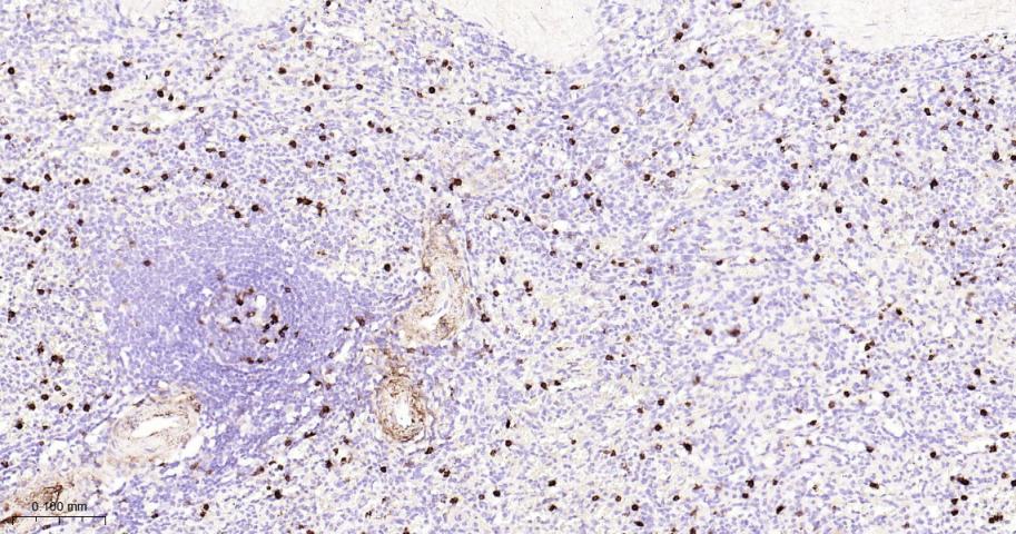 Paraformaldehyde-fixed, paraffin embedded Human Spleen; Antigen retrieval by boiling in sodium citrate buffer (pH6.0) for 15 min; Antibody incubation with CD57 Monoclonal Antibody, Unconjugated(bsm-60790M) at 1:100 overnight at 4°C, followed by conjugation to the bs-40296G-HRP and DAB (C-0010) staining.