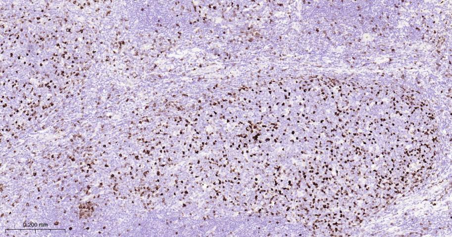 Paraformaldehyde-fixed, paraffin embedded Human Tonsil; Antigen retrieval by boiling in sodium citrate buffer (pH6.0) for 15 min; Antibody incubation with CD57 Monoclonal Antibody, Unconjugated(bsm-60790M) at 1:100 overnight at 4°C, followed by conjugation to the bs-40296G-HRP and DAB (C-0010) staining.
