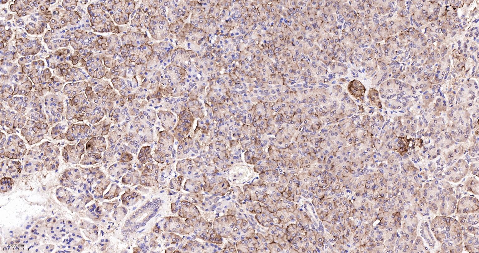 Paraformaldehyde-fixed, paraffin embedded Human Pancreas; Antigen retrieval by boiling in sodium citrate buffer (pH6.0) for 15 min; The section was incubated with CD99 Monoclonal Antibody, Unconjugated (bsm-60792R) at 1:200 overnight at 4°C, followed by conjugation to the bs-0295G-HRP and DAB (C-0010) staining.