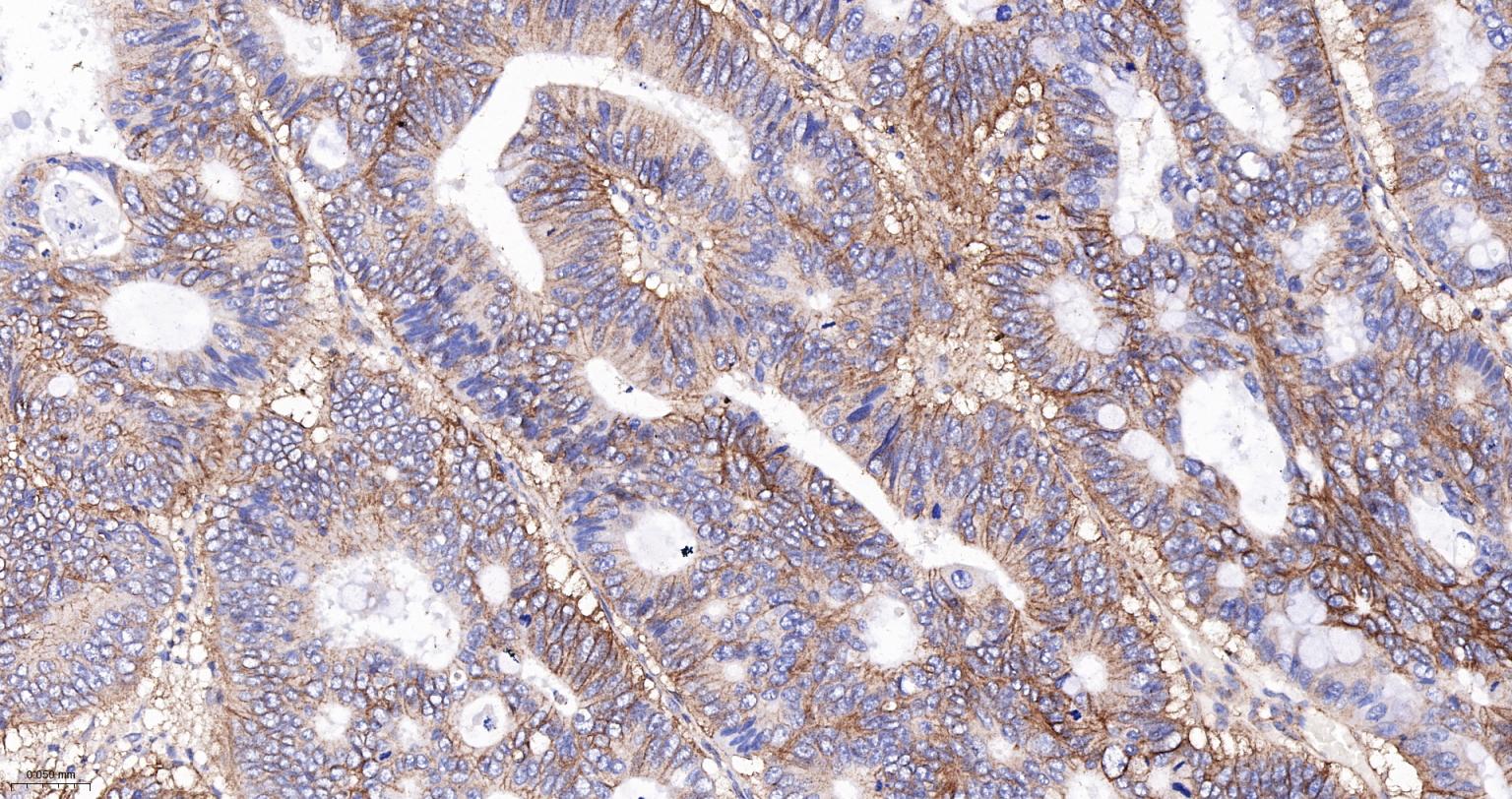 Paraformaldehyde-fixed, paraffin embedded Human Colon Cancer; Antigen retrieval by boiling in sodium citrate buffer (pH6.0) for 15 min; The section was incubated with CD99 Monoclonal Antibody, Unconjugated (bsm-60792R) at 1:200 overnight at 4°C, followed by conjugation to the bs-0295G-HRP and DAB (C-0010) staining.