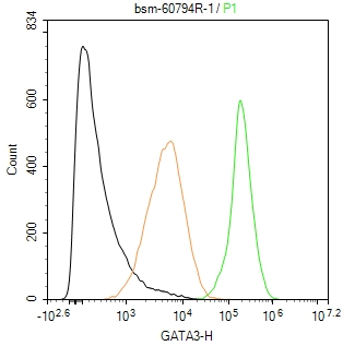 The T-47D (H) cells were fixed with 4% PFA (10 min at r.t.) and then permeabilized with 90% ice-cold methanol for 20 min at -20℃,the cells then were incubated in 5%BSA to block non-specific protein-protein interactions (30 min at r.t.), followed by secondary antibody incubation for 40 min at room temperature. Primary Antibody (green):Rabbit Anti-GATA3 antibody (bsm-60794R,1:100); Isotype Control (orange): Rabbit IgG (bs-0295P). Blank control (black): PBS. Acquisition of 20,000 events was performed.