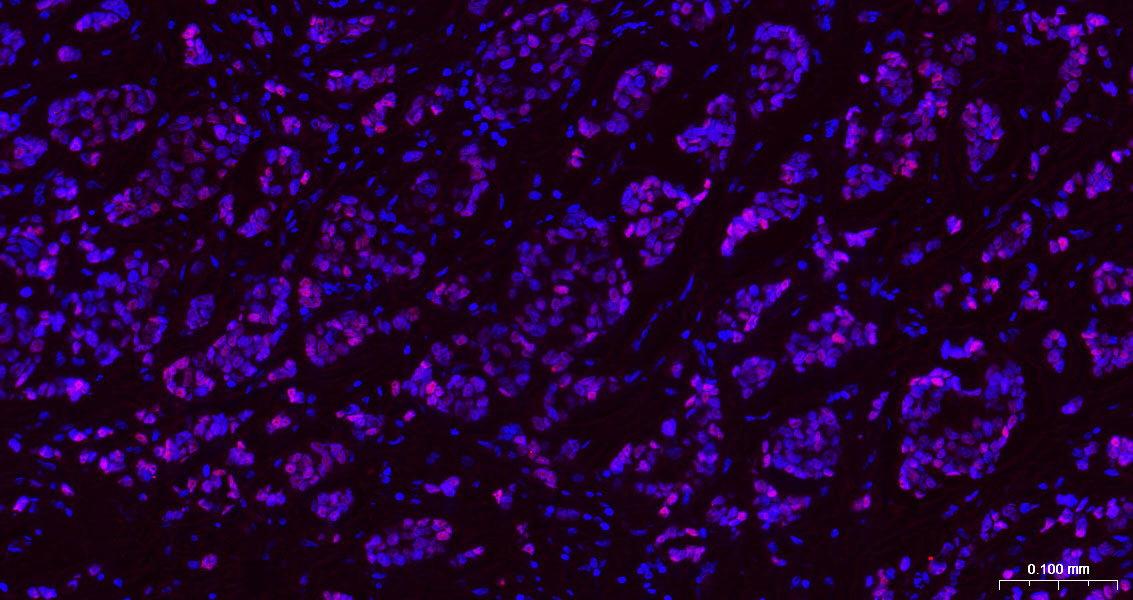 Paraformaldehyde-fixed, paraffin embedded human Breast Cancer; Antigen retrieval by boiling in sodium citrate buffer (pH6.0) for 15 min; The section was incubated with GATA3 Monoclonal Antibody, Unconjugated (bsm-60794R) at 1:200 overnight at 4°C. Followed by conjugated Goat Anti-Rabbit IgG antibody (Rouse Red, bs-0295G-BF647), DAPI (blue, C02-04002) was used to stain the cell nuclei.