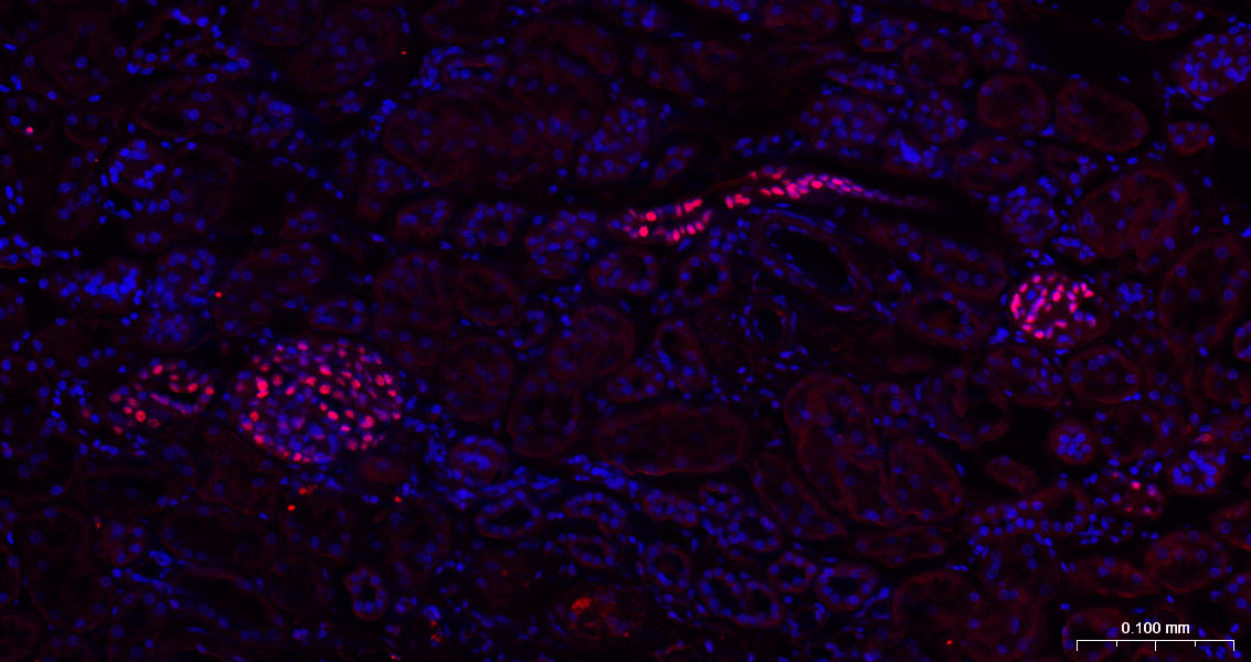 Paraformaldehyde-fixed, paraffin embedded human kidney; Antigen retrieval by boiling in sodium citrate buffer (pH6.0) for 15 min; The section was incubated with GATA3 Monoclonal Antibody, Unconjugated (bsm-60794R) at 1:200 overnight at 4°C. Followed by conjugated Goat Anti-Rabbit IgG antibody (Rouse Red, bs-0295G-BF647), DAPI (blue, C02-04002) was used to stain the cell nuclei.
