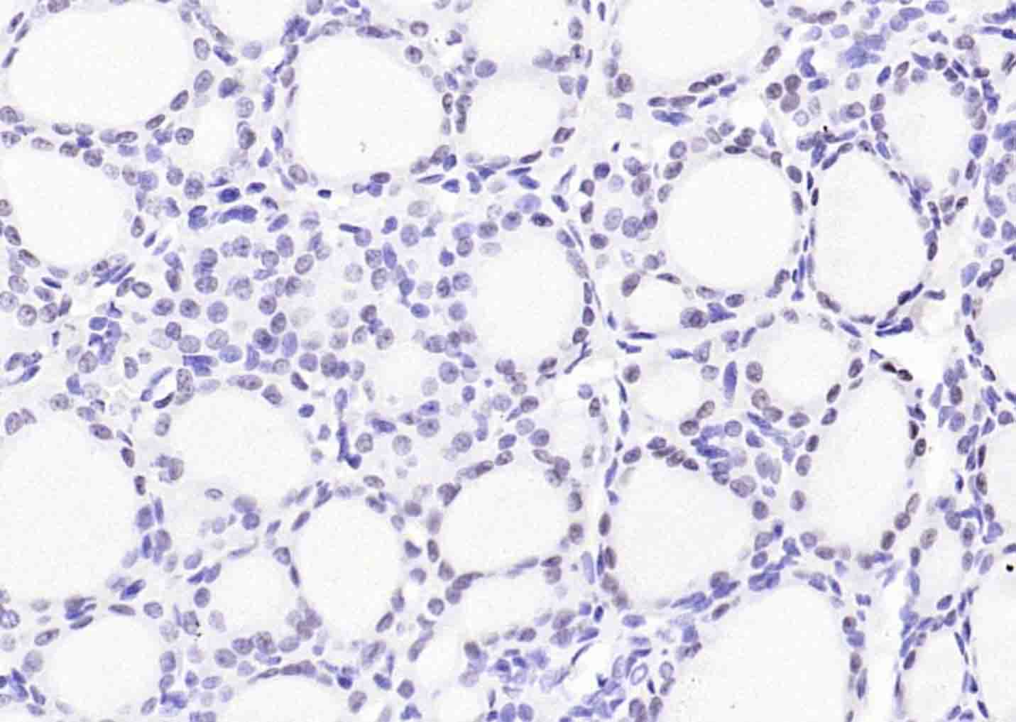 Paraformaldehyde-fixed, paraffin embedded (rat thyroid gland); Antigen retrieval by boiling in sodium citrate buffer (pH6.0) for 15min; Block endogenous peroxidase by 3% hydrogen peroxide for 20 minutes; Blocking buffer (normal goat serum) at 37°C for 30min; Incubation with (TTF1/NKX2-1 ) Monoclonal Antibody, Unconjugated (bsm-34158M) at 1:200 overnight at 4°C, followed by operating according to SP Kit(Mouse)(sp-0024) instructionsand DAB staining.