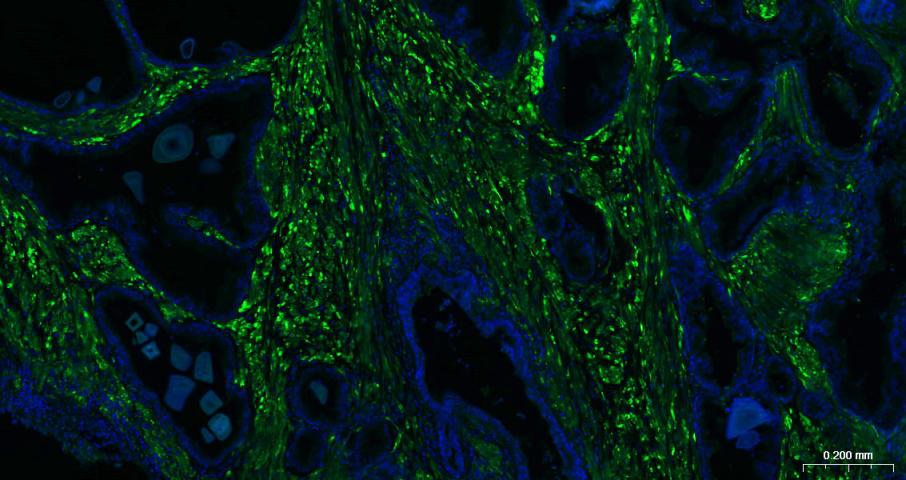 Paraformaldehyde-fixed, paraffin embedded Human Prostate; Antigen retrieval by boiling in sodium citrate buffer (pH6.0) for 15 min; The section was incubated with CNN1 Monoclonal Antibody, Unconjugated (bsm-60845R) at 1:200 overnight at 4°C. Followed by conjugated Goat Anti-Rabbit IgG antibody (green, bs-0295G-BF488), DAPI (blue, C02-04002) was used to stain the cell nuclei.
