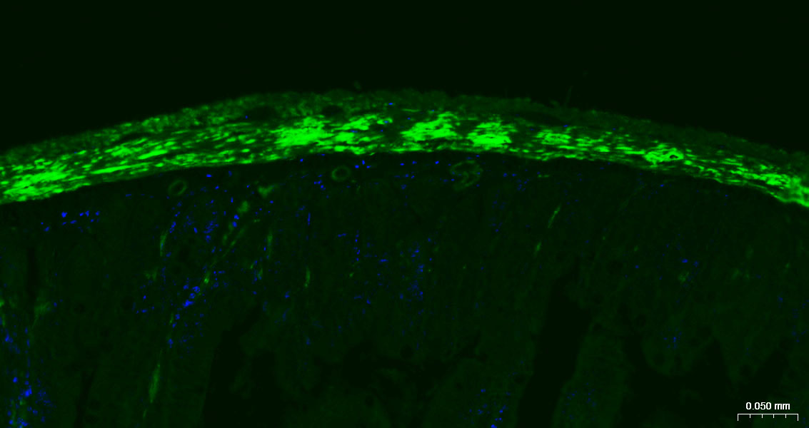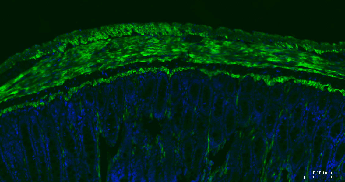 Paraformaldehyde-fixed, paraffin embedded Mouse Small Intestine; Antigen retrieval by boiling in sodium citrate buffer (pH6.0) for 15 min; The section was incubated with CNN1 Monoclonal Antibody, Unconjugated (bsm-60845R) at 1:200 overnight at 4°C. Followed by conjugated Goat Anti-Rabbit IgG antibody (green, bs-0295G-BF488), DAPI (blue, C02-04002) was used to stain the cell nuclei.