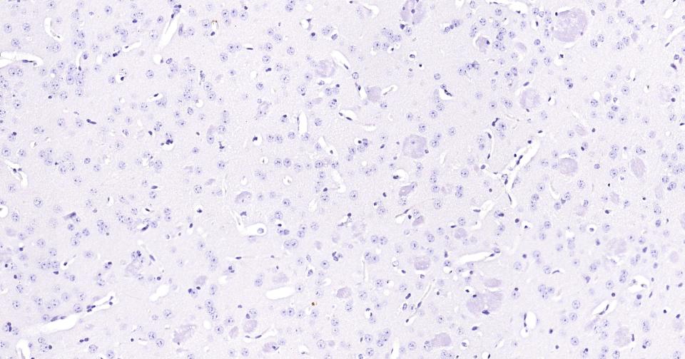 (Negative control) Paraformaldehyde-fixed, paraffin embedded Mouse Cerebrum; Antigen retrieval by boiling in sodium citrate buffer (pH6.0) for 15 min; Antibody incubation with CD36 Polyclonal Antibody, Unconjugated (bs-42054R) at 1:200 overnight at 4°C, followed by conjugation to the SP Kit (Rabbit, SP-0023) and DAB (C-0010) staining.