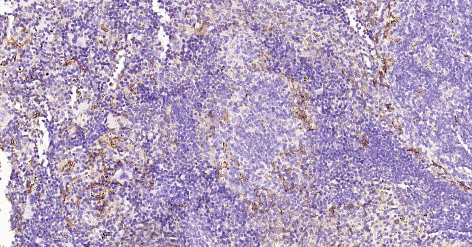 Paraformaldehyde-fixed, paraffin embedded Mouse Spleen; Antigen retrieval by boiling in sodium citrate buffer (pH6.0) for 15 min; Antibody incubation with CD36 Polyclonal Antibody, Unconjugated (bs-42054R) at 1:200 overnight at 4°C, followed by conjugation to the SP Kit (Rabbit, SP-0023) and DAB (C-0010) staining.