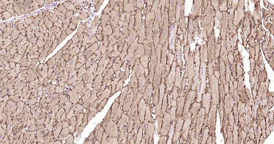 Paraformaldehyde-fixed, paraffin embedded Mouse Heart; Antigen retrieval by boiling in sodium citrate buffer (pH6.0) for 15 min; Antibody incubation with CD36 Polyclonal Antibody, Unconjugated (bs-42054R) at 1:200 overnight at 4°C, followed by conjugation to the SP Kit (Rabbit, SP-0023) and DAB (C-0010) staining.