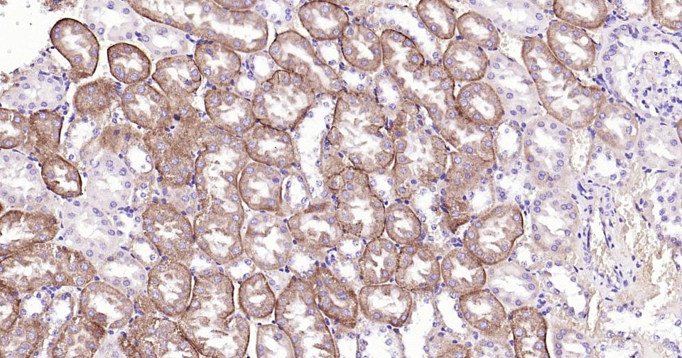 Paraformaldehyde-fixed, paraffin embedded Mouse Kidney; Antigen retrieval by boiling in sodium citrate buffer (pH6.0) for 15 min; Antibody incubation with CD36 Polyclonal Antibody, Unconjugated (bs-42054R) at 1:200 overnight at 4°C, followed by conjugation to the SP Kit (Rabbit, SP-0023) and DAB (C-0010) staining.
