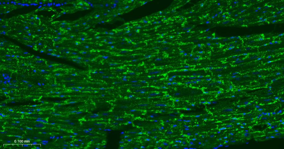 Paraformaldehyde-fixed, paraffin embedded Mouse Heart; Antigen retrieval by boiling in sodium citrate buffer (pH6.0) for 15 min; Antibody incubation with CD36 Polyclonal Antibody, Unconjugated (bs-42054R) at 1:200 overnight at 4°C. Followed by conjugated Goat Anti-Rabbit IgG antibody (green, bs-0295G-BF488), DAPI (blue, C02-04002) was used to stain the cell nuclei.