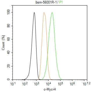 The Hela (H) cells were fixed with 4% PFA (10 min at r.t.) and then permeabilized with 90% ice-cold methanol for 20 min at -20℃,the cells then were incubated in 5%BSA to block non-specific protein-protein interactions (30 min at r.t.), followed by secondary antibody incubation for 40 min at room temperature. Primary Antibody (green):Rabbit Anti-c-Myc antibody (bsm-56001R): 1 μg/10^6 cells; Isotype Control (orange): Rabbit IgG (bs-0295P). Blank control (black): PBS. Acquisition of 20,000 events was performed.