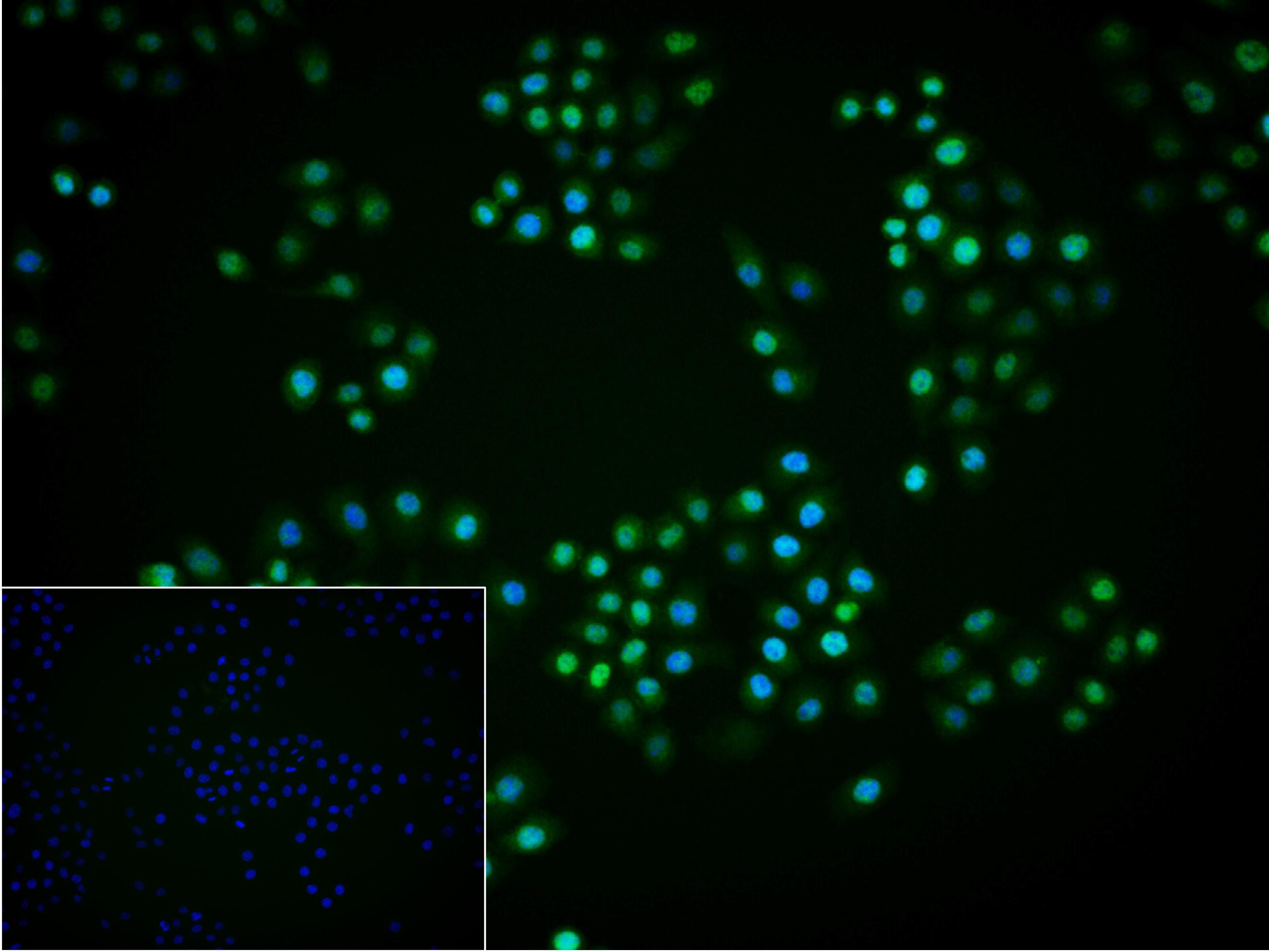 4% Paraformaldehyde-fixed Hela (H) cell; Triton X-100 at r.t. for 20 min; Antibody incubation with (c-Myc) monoclonal Antibody, unconjugated (bsm-56001R) 1:100, 90 min at 37°C; followed by conjugated Goat Anti-Rabbit IgG antibody (green, bs-60295G-BF488) at 37°C for 90 min, DAPI (blue, C02-04002) was used to stain the cell nuclei. PBS instead of the primary antibody was used as the blank control.