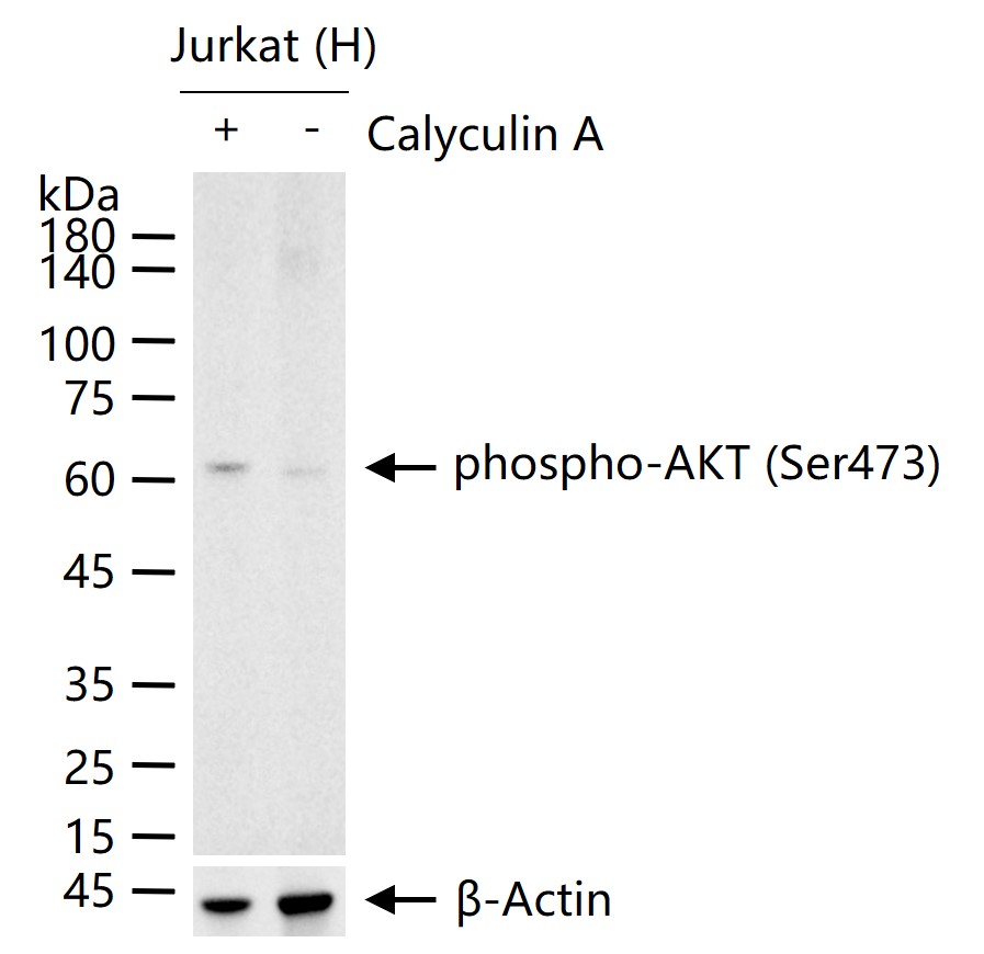 Jurkat (H) cells were treated with or without Calyculin A (100nM) for 30 min, 25 μg total protein per lane of cell lysates (see on figure) probed with phospho-AKT (Ser473) monoclonal antibody, unconjugated (bsm-56203R) at 1:1000 dilution and 4°C overnight incubation. Followed by conjugated secondary antibody incubation at r.t. for 60 min.