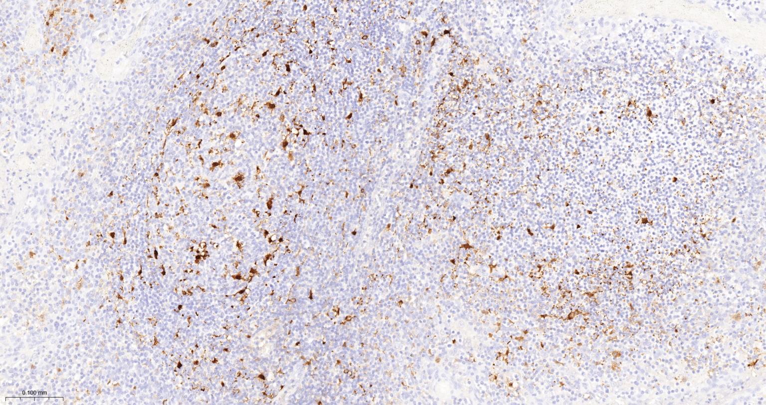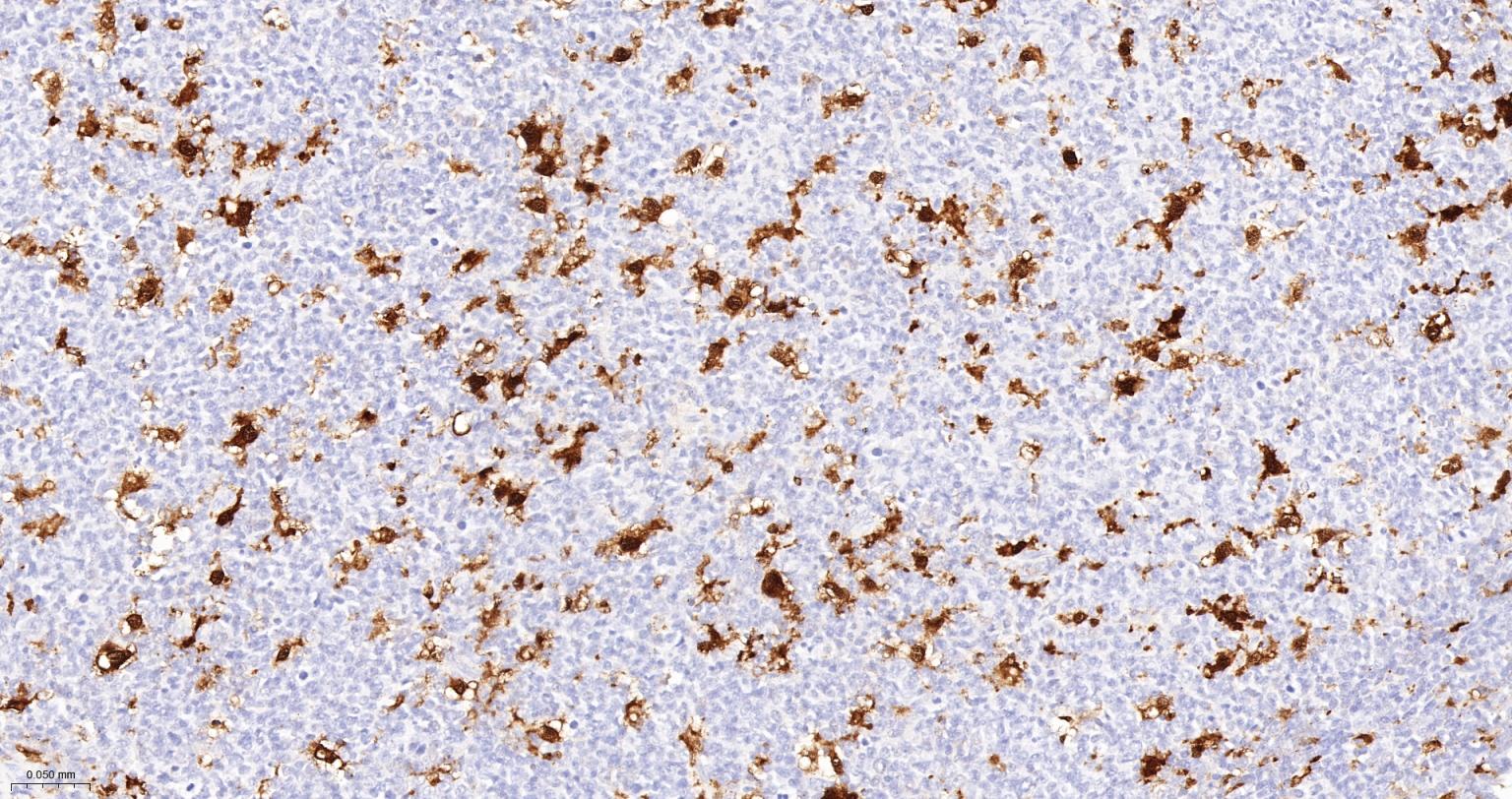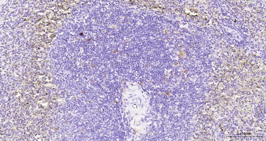 Paraformaldehyde-fixed, paraffin embedded (Human spleen); Antigen retrieval by boiling in sodium EDTA buffer (Ph9.0) for 15min; Block endogenous peroxidase by 3% hydrogen peroxide for 20 minutes; Blocking buffer (normal goat serum) at 37°C for 30min; Incubation with (IL18) Monoclonal Antibody, Unconjugated (bsm-56205R) at 1:250 overnight at 4°C, followed by operating according to SP Kit(Rabbit) (sp-0023) instructionsand DAB staining.