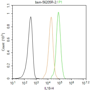 The Hela (H) cells were fixed with 4% PFA (10 min at r.t.) and then permeabilized with 90% ice-cold methanol for 20 min at -20℃,the cells then were incubated in 5%BSA to block non-specific protein-protein interactions (30 min at r.t.), followed by secondary antibody incubation for 40 min at room temperature. Primary Antibody (green):Rabbit Anti-IL18 antibody (bsm-56205R,1:100); Isotype Control (orange): Rabbit IgG (bs-0295P). Blank control (black): PBS. Acquisition of 20,000 events was performed.