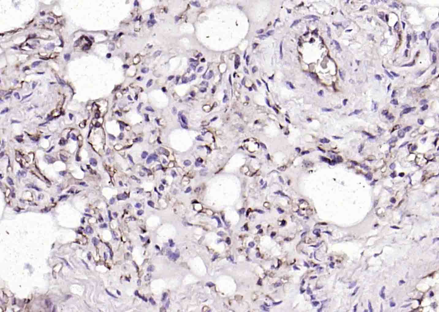 Paraformaldehyde-fixed, paraffin embedded (human lung ); Antigen retrieval by boiling in sodium citrate buffer (pH6.0) for 15min; Block endogenous peroxidase by 3% hydrogen peroxide for 20 minutes; Blocking buffer (normal goat serum) at 37°C for 30min; Incubation with (HLA E) Polyclonal Antibody, Unconjugated (bs-42249R) at 1:200 overnight at 4°C, followed by operating according to SP Kit(Rabbit) (sp-0023) instructionsand DAB staining.