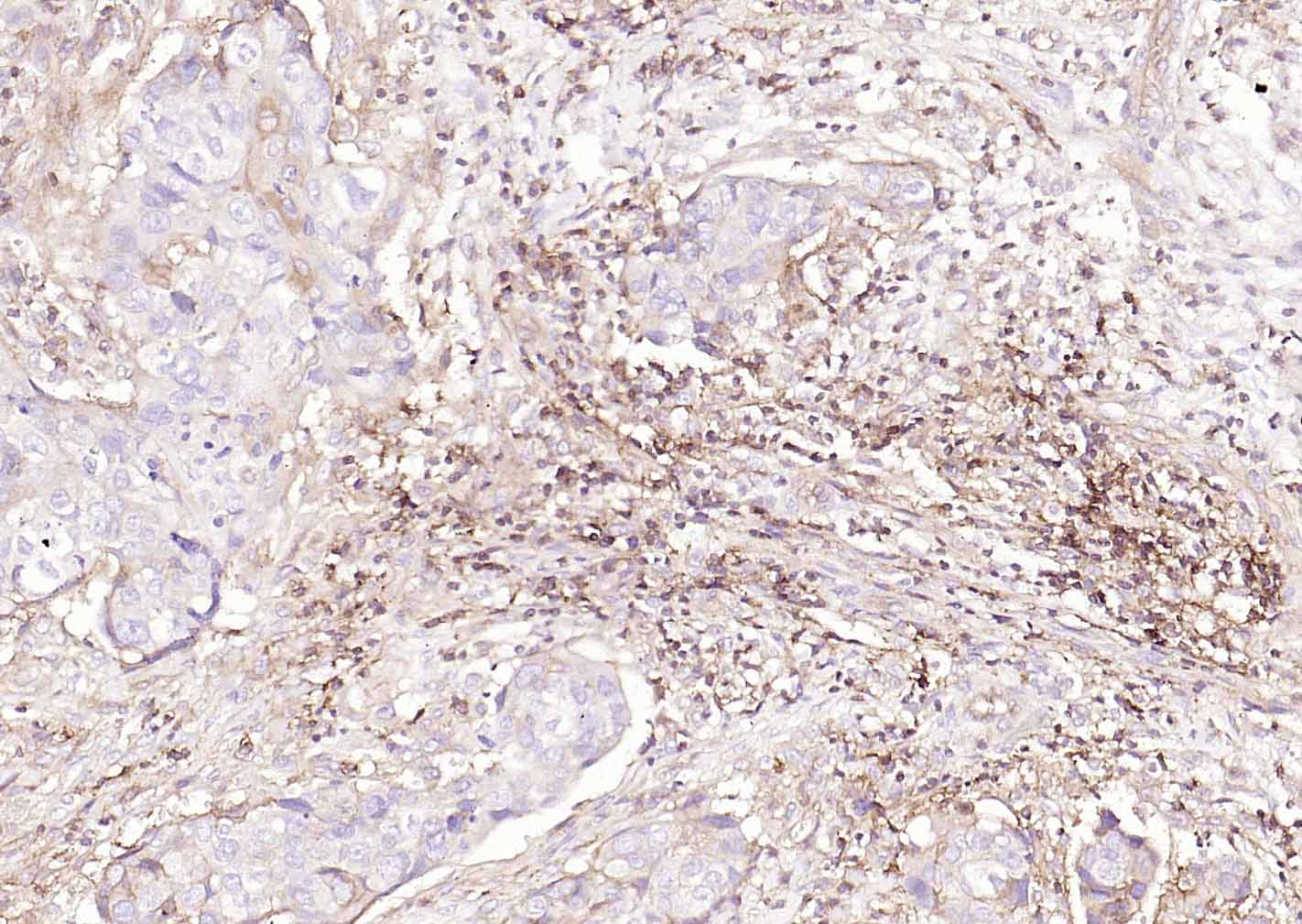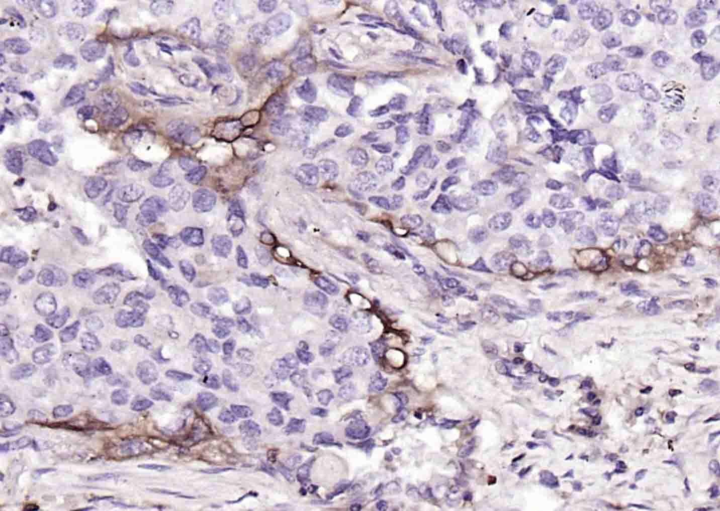 Paraformaldehyde-fixed, paraffin embedded (human lung carcinoma); Antigen retrieval by boiling in sodium citrate buffer (pH6.0) for 15min; Block endogenous peroxidase by 3% hydrogen peroxide for 20 minutes; Blocking buffer (normal goat serum) at 37°C for 30min; Incubation with (HLA E) Polyclonal Antibody, Unconjugated (bs-42249R) at 1:200 overnight at 4°C, followed by operating according to SP Kit(Rabbit) (sp-0023) instructionsand DAB staining.