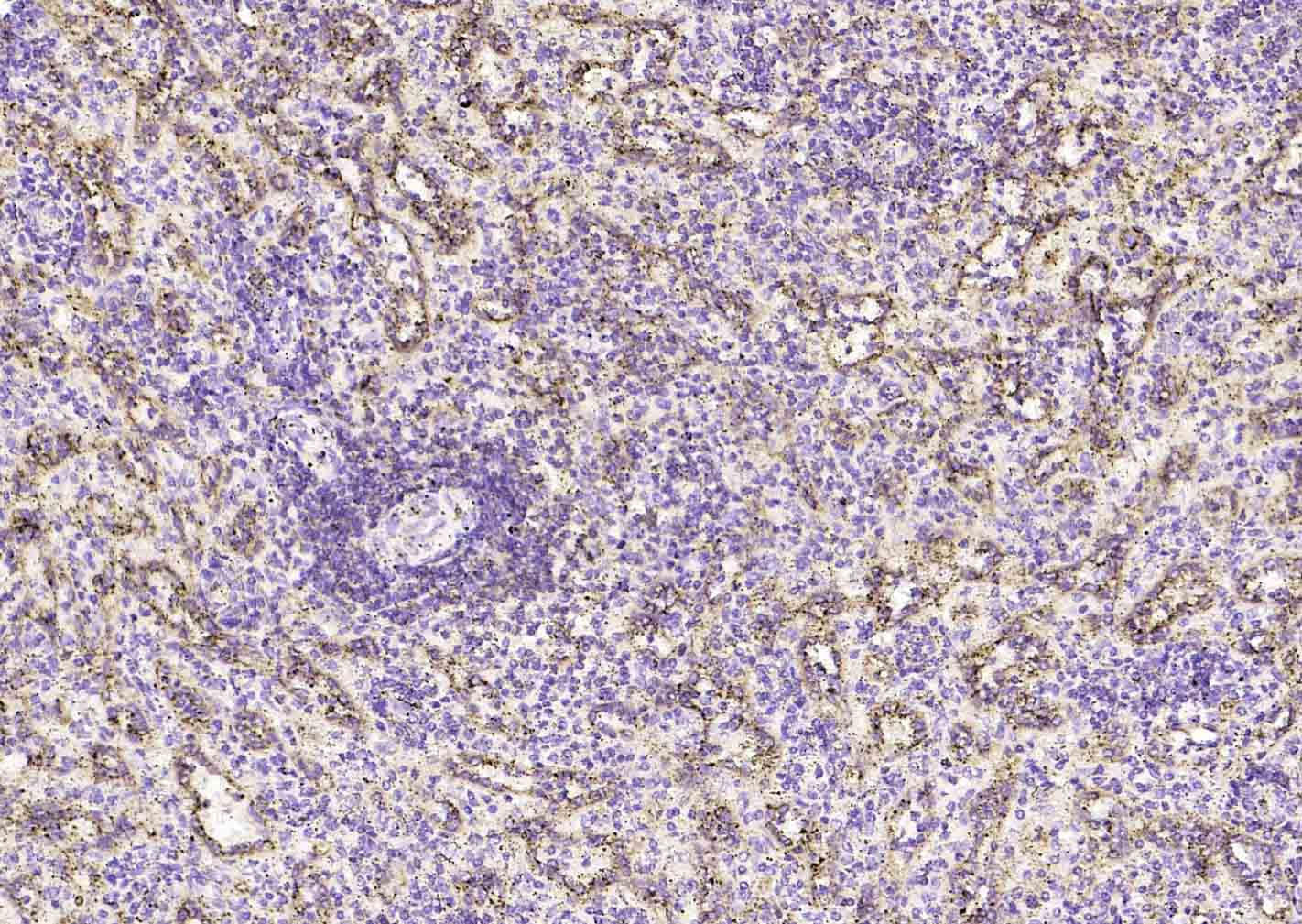 Paraformaldehyde-fixed, paraffin embedded (human spleen); Antigen retrieval by boiling in sodium citrate buffer (pH6.0) for 15min; Block endogenous peroxidase by 3% hydrogen peroxide for 20 minutes; Blocking buffer (normal goat serum) at 37°C for 30min; Incubation with (HLA E) Polyclonal Antibody, Unconjugated (bs-42249R) at 1:200 overnight at 4°C, followed by operating according to SP Kit(Rabbit) (sp-0023) instructionsand DAB staining.