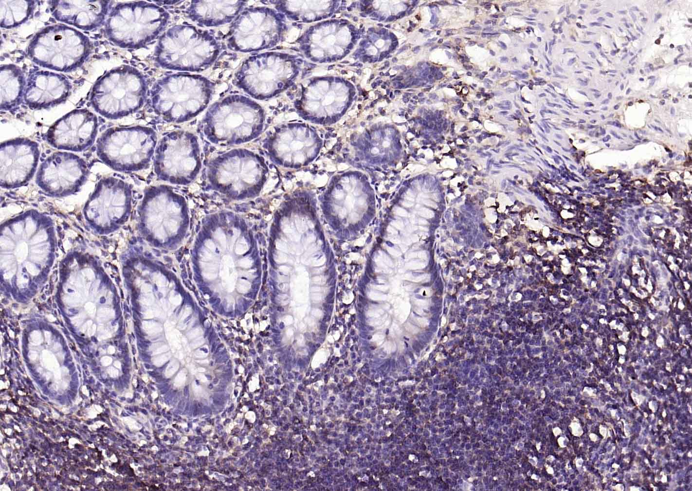 Paraformaldehyde-fixed, paraffin embedded (human colon); Antigen retrieval by boiling in sodium citrate buffer (pH6.0) for 15min; Block endogenous peroxidase by 3% hydrogen peroxide for 20 minutes; Blocking buffer (normal goat serum) at 37°C for 30min; Incubation with (HLA E) Polyclonal Antibody, Unconjugated (bs-42249R) at 1:200 overnight at 4°C, followed by operating according to SP Kit(Rabbit) (sp-0023) instructionsand DAB staining.