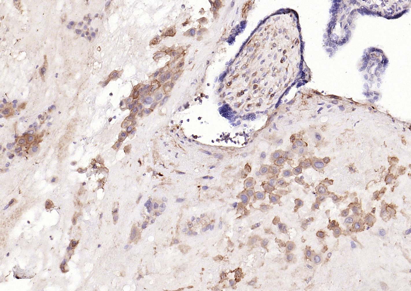 Paraformaldehyde-fixed, paraffin embedded (human placenta); Antigen retrieval by boiling in sodium citrate buffer (pH6.0) for 15min; Block endogenous peroxidase by 3% hydrogen peroxide for 20 minutes; Blocking buffer (normal goat serum) at 37°C for 30min; Incubation with (HLA E) Polyclonal Antibody, Unconjugated (bs-42249R) at 1:200 overnight at 4°C, followed by operating according to SP Kit(Rabbit) (sp-0023) instructionsand DAB staining.