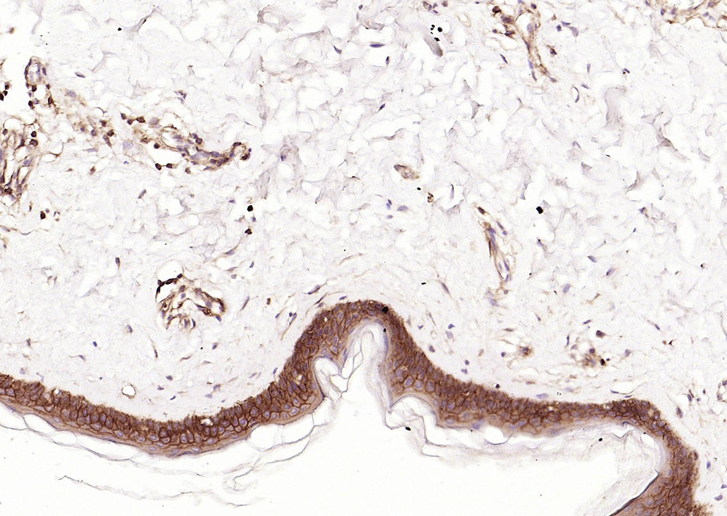Paraformaldehyde-fixed, paraffin embedded (human Abdominal skin); Antigen retrieval by boiling in sodium citrate buffer (pH6.0) for 15min; Block endogenous peroxidase by 3% hydrogen peroxide for 20 minutes; Blocking buffer (normal goat serum) at 37°C for 30min; Incubation with (HLA E) Polyclonal Antibody, Unconjugated (bs-42249R) at 1:200 overnight at 4°C, followed by operating according to SP Kit(Rabbit) (sp-0023) instructionsand DAB staining.