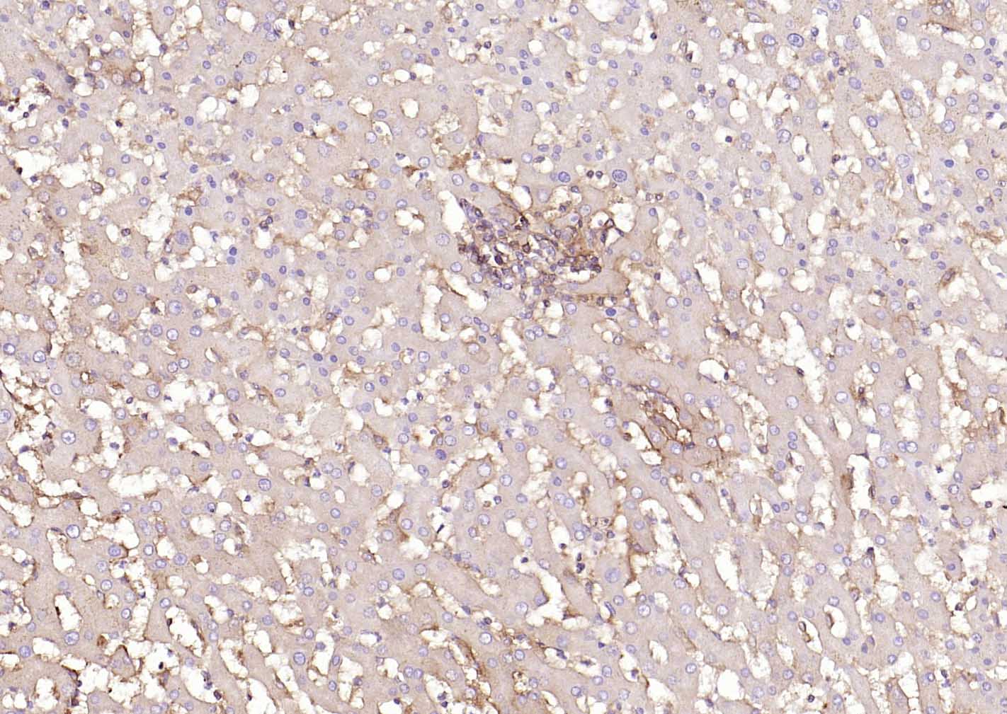 Paraformaldehyde-fixed, paraffin embedded (human liver); Antigen retrieval by boiling in sodium citrate buffer (pH6.0) for 15min; Block endogenous peroxidase by 3% hydrogen peroxide for 20 minutes; Blocking buffer (normal goat serum) at 37°C for 30min; Incubation with (HLA E) Polyclonal Antibody, Unconjugated (bs-42249R) at 1:200 overnight at 4°C, followed by operating according to SP Kit(Rabbit) (sp-0023) instructionsand DAB staining.