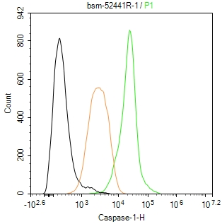 The THP-1 (H) cells were fixed with 4% PFA (10 min at r.t.) and then permeabilized with 90% ice-cold methanol for 20 min at -20℃,the cells then were incubated in 5%BSA to block non-specific protein-protein interactions (30 min at r.t.), followed by secondary antibody incubation for 40 min at room temperature. Primary Antibody (green):Rabbit Anti-Caspase-1 antibody (bsm-52441R): 1 μg/10^6 cells; Isotype Control (orange): Rabbit IgG (bs-0295P). Blank control (black): PBS. Acquisition of 20,000 events was performed.