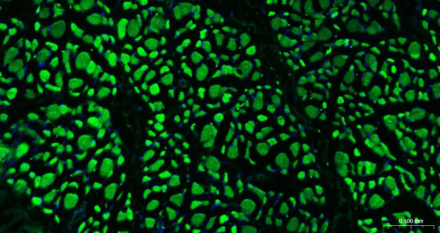 Paraformaldehyde-fixed, paraffin embedded Human Skeletal muscle; Antigen retrieval by boiling in sodium citrate buffer (pH6.0) for 15 min; Antibody incubation with MYH1 Polyclonal Antibody, Unconjugated (bs-42269R) at 1:200 overnight at 4°C. Followed by conjugated Goat Anti-Rabbit IgG antibody (green, bs-0295G-BF488), DAPI (blue, C02-04002) was used to stain the cell nuclei.