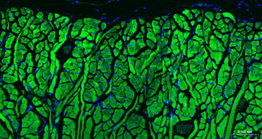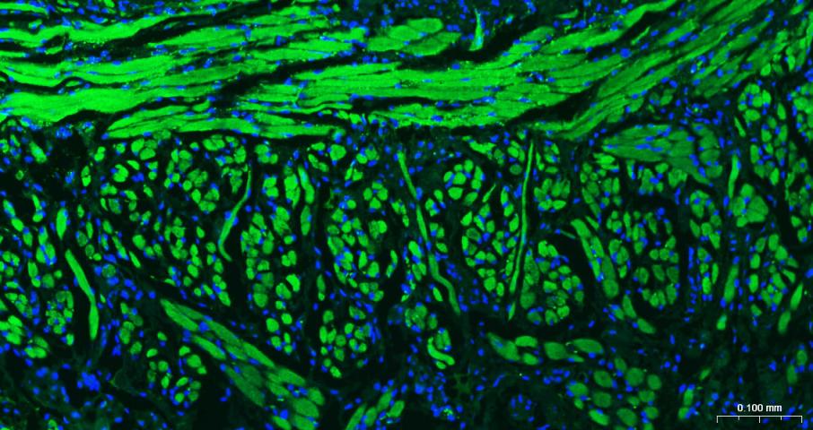 Paraformaldehyde-fixed, paraffin embedded Mouse Tongue; Antigen retrieval by boiling in sodium citrate buffer (pH6.0) for 15 min; Antibody incubation with MYH1 Polyclonal Antibody, Unconjugated (bs-42269R) at 1:200 overnight at 4°C. Followed by conjugated Goat Anti-Rabbit IgG antibody (green, bs-0295G-BF488), DAPI (blue, C02-04002) was used to stain the cell nuclei.