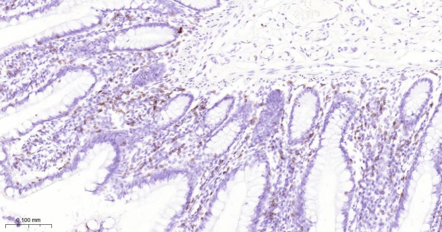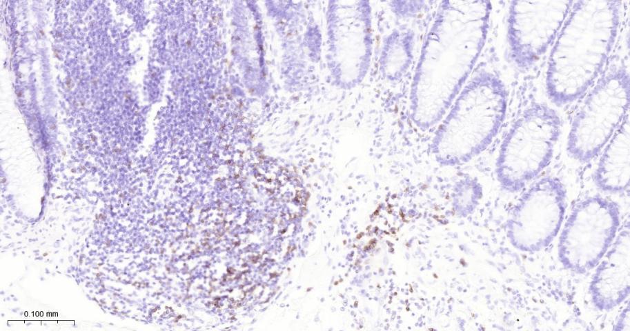 Paraformaldehyde-fixed, paraffin embedded Human Small Intestine; Antigen retrieval by boiling in sodium citrate buffer (pH6.0) for 15 min; The section was incubated with CD8A Monoclonal Antibody, Unconjugated (bsm-34251M) at 1:1500 overnight at 4°C, followed by conjugation to the bs-40296G-HRP and DAB (C-0010) staining.