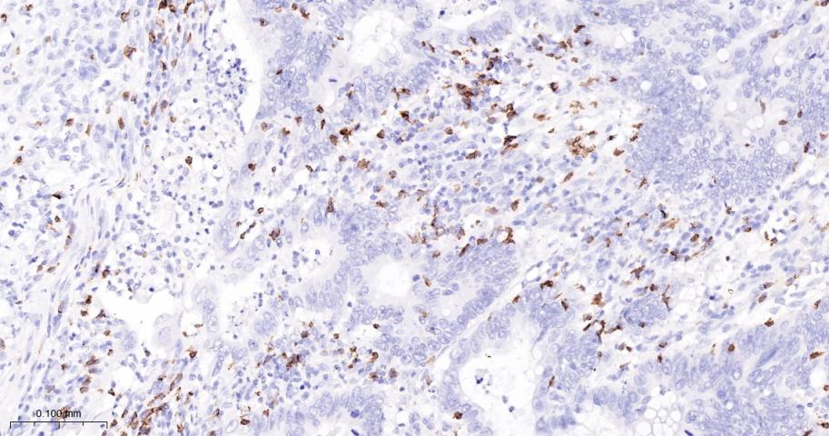 Paraformaldehyde-fixed, paraffin embedded Human Colon; Antigen retrieval by boiling in sodium citrate buffer (pH6.0) for 15 min; The section was incubated with CD8A Monoclonal Antibody, Unconjugated (bsm-34251M) at 1:1500 overnight at 4°C, followed by conjugation to the bs-40296G-HRP and DAB (C-0010) staining.