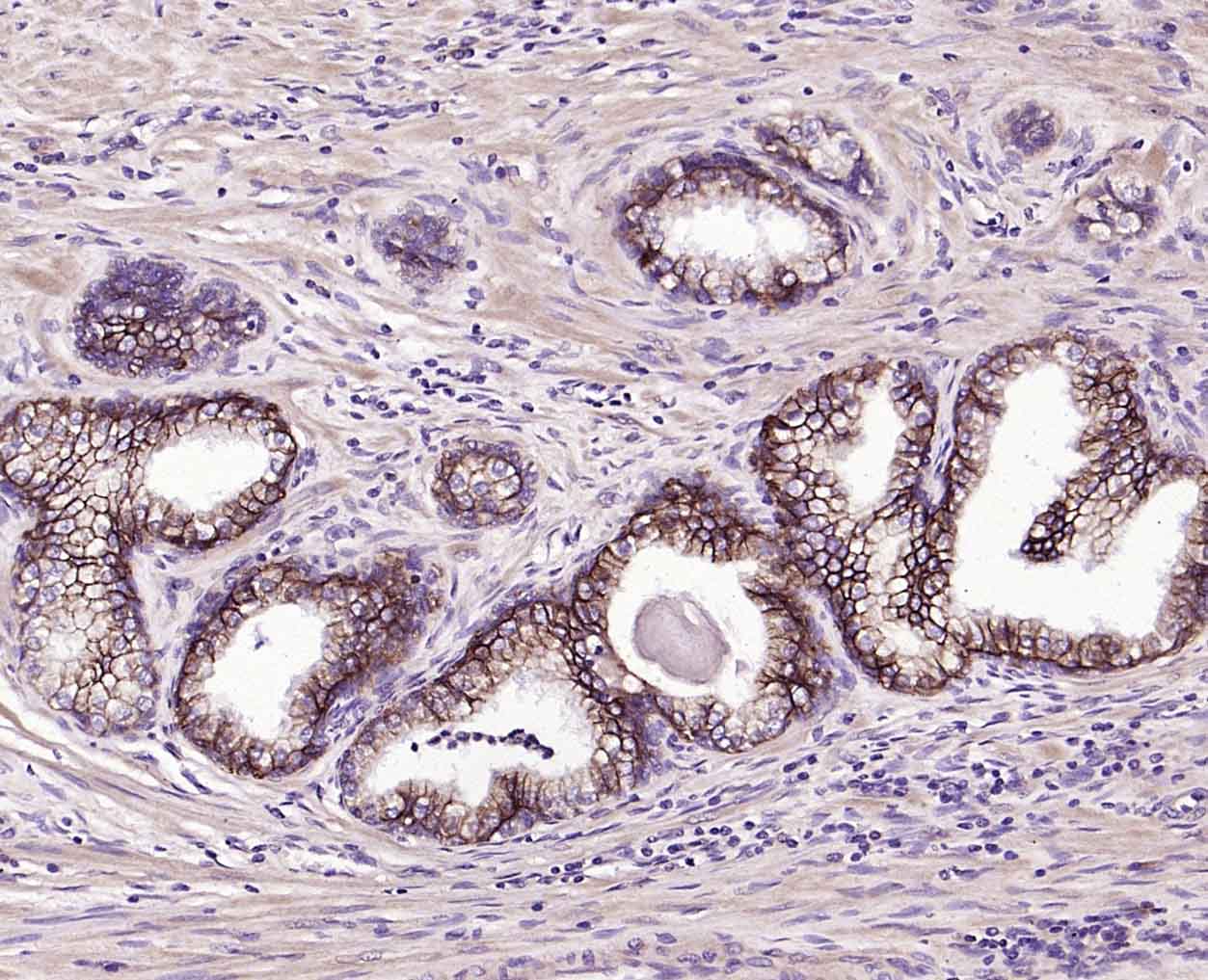 Paraformaldehyde-fixed, paraffin embedded (Human Prostate); Antigen retrieval by boiling in sodium citrate buffer (pH6.0) for 15min; Block endogenous peroxidase by 3% hydrogen peroxide for 20 minutes; Blocking buffer (normal goat serum) at 37°C for 30min; Incubation with (TROP2) Monoclonal Antibody, Unconjugated (bsm-43037M) at 1:200 overnight at 4°C, followed by operating according to SP Kit(Mouse)(sp-0024) instructionsand DAB staining.